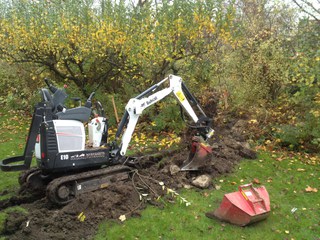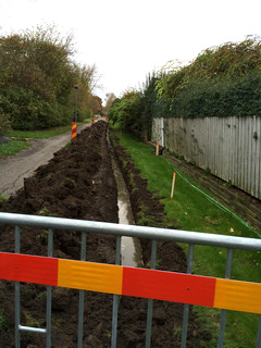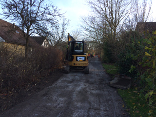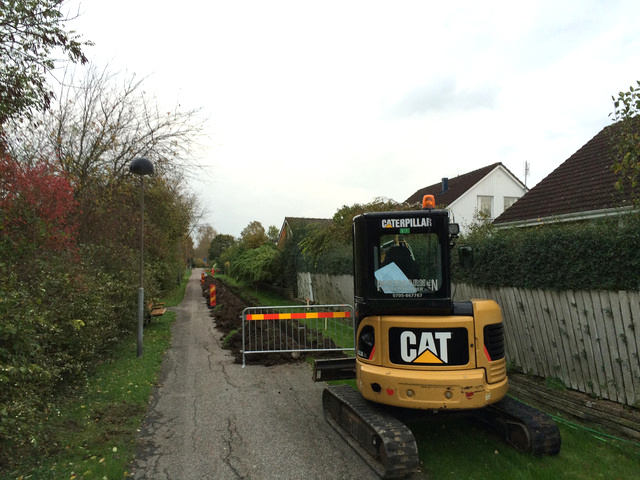 Första delen av installationen, nedgrävningen av huvudnätet i området, avslutas. Andra delen är att ansluta fastigheterna till detta huvudnät. |