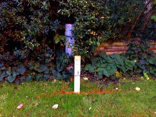 Pinnar har satts ut i området som tillsammans med färg markerar var befintlig tele- resp. elkabel är nergrävd (orange = tele, blå = el): |